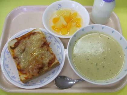 献立 :ピザトースト コーンポタージュ フルーツポンチ 牛乳