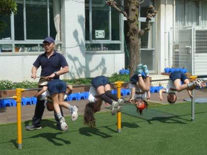 本年度、本校では「自ら進んで運動する子どもの育成」というテーマでのもと、体育の授業力を向上させ、運動の大好きな子どもを育てたいと考えています。今日は、その第1回として筑波大学附属小学校教諭の平川譲先生に示範授業をお願いしました。2年生の子どもたちは、今日先生と初めて出会うのがうそのように、鉄棒遊びやはしごドッジボールを楽しみ、最後は先生とハイタッチでわかれました。これから平川先生には年間8回お越しいただき、各学年、あすなろ学級の授業にご指導をいただく予定です。