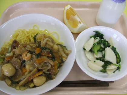 献立 :五目あんかけそば かぶときゅうりのサラダ 美生柑 牛乳