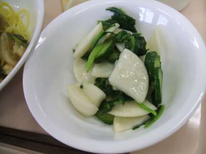 今日のサラダには、白いかぶの根だけでなく、緑色の葉も使っています。