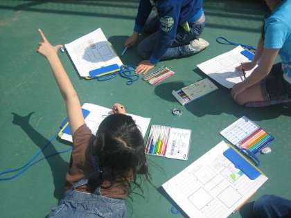 東西南北を班で確かめ、学校の周りの様子を絵と文を使ってカードに書き込んでいました。