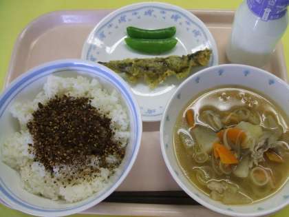献立 :おかかふりかけごはん 豚汁 ししゃもの磯辺揚げ スナップえんどう 牛乳