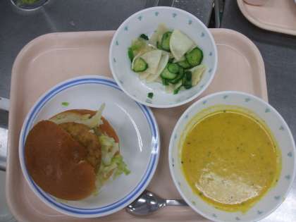 豆腐ハンバーガー、かぼちゃのポタージュ、