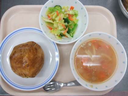 手作りコーンポテトパン、 ミネストローネ、フレンチサラダ、牛乳