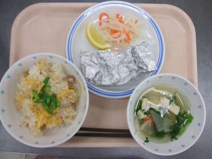 ちらし寿司、すまし汁、魚の菜種焼き、紅白なます、牛乳