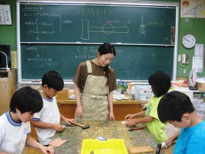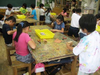 金槌を使うので、みんな真剣です。釘を上手に打ちこんで、顔や動物など思い思いの物を作っていました。