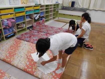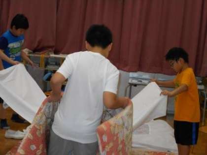楽しかった1日も終わり、就寝の準備です。みんな自分で布団を敷くのを頑張りました。
