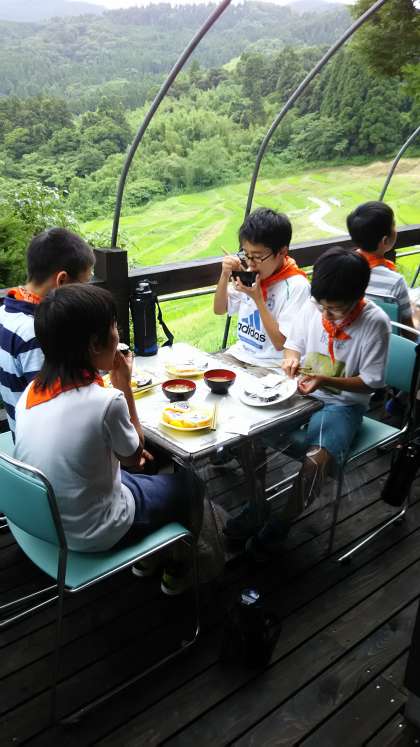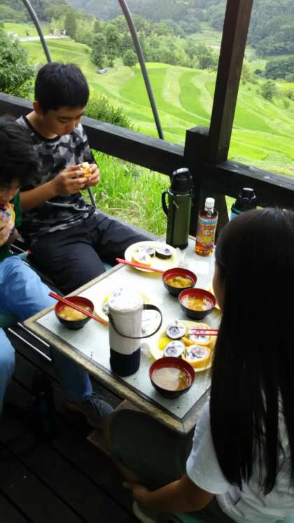 デッキで棚田の風に優しく吹かれながら、まつり寿司を食べています。