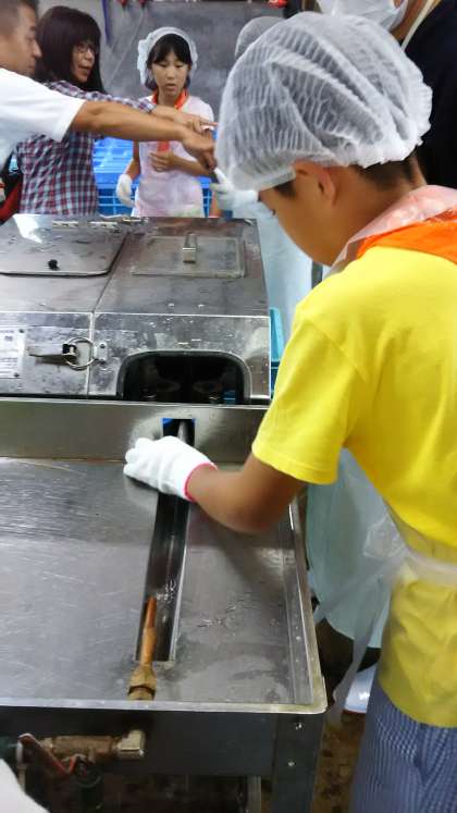 工場の方に教えていただきながら、頑張って干物を作っています。