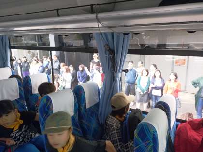 学校で出発式を行い、バスに乗り込みました。