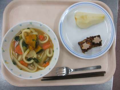 ほうとううどん、生揚げの田楽、ラフランス、牛乳