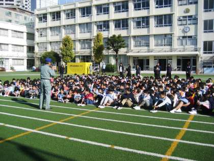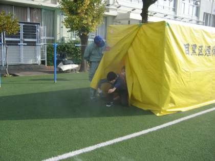 通常の訓練のように校庭に避難した後、全校児童が煙りハウス体験をしました。
