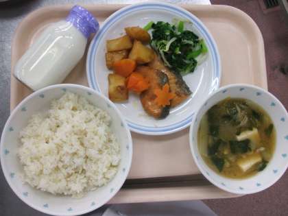 ごはん、鮭とじゃがいものつや煮、小松菜の煮びたし、