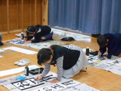 「お正月」「友だち」のどちらかを選び、大きな半紙に書きました。
