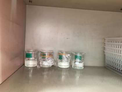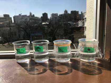 「自然の中の水のすがた」では、水は自然に蒸発するかについてみんなで考えました。日当たりのよい場所と、日が当たらない場所に3日間水を置いて、どれくらい水が減ったのかを調べました。