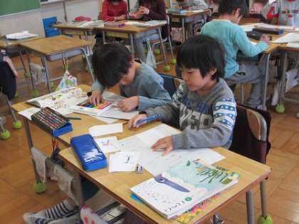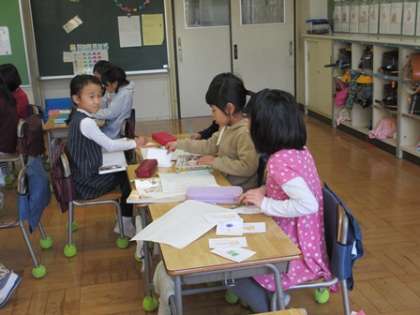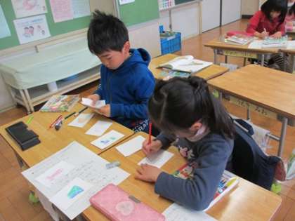 おみせやさんごっこをしよう 公開日 2017/02/02 更新日 2017/02/02 1年 1年生の国語では「おみせやさんごっこをしよう」という学習をしています。 2組では、それぞれのお店で売るものを決めてカードにかきました。 「お客さんがよろこんでくれるといいな。」「早くおみせをやりたいな。」と来週の発表に向けて、今からワクワクしながら準備をしています。 いいね(0)