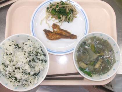ワカメごはん、ハタハタの竜田揚げ、きりたんぽ汁、