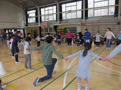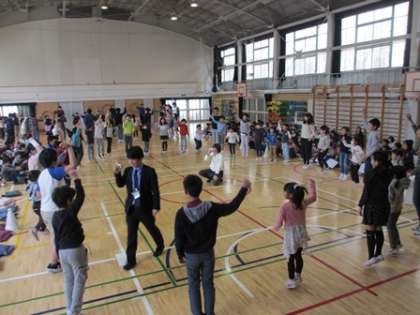 呼びかけの最後には「6年生と遊びた〜い!一緒にガッツを踊ってください!!」とお願いをして、6年生と楽しくガッツを踊りました。大きな6年生は1年生の背の高さに合わせて低くなってくれたり、歩調を合わせてくれたり、本当に優しい6年生です。