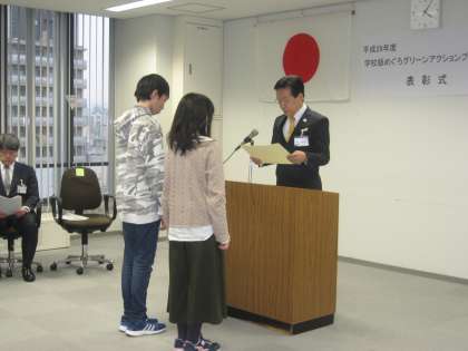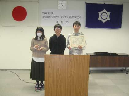 3月6日に表彰式が行われ、学校を代表して6年生の環境委員会の児童が出席し、教育長から賞状と記念品(ガラスの置物)をいただきました。