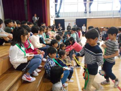 3年 1年生を迎える会 公開日 2017/04/21 更新日 2017/04/21 3年 先日作ったメダルを1年生にプレゼントしました。 とても嬉しそうにメッセージを読んでいました。 大事にお家に持って帰ってくれたそうです。 これから仲良くしましょうね! いいね(0)