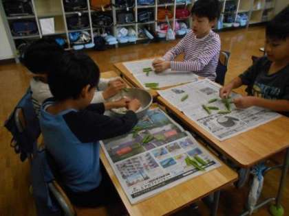 今日は、1組のみんなでグリンピースのさやむきを行いました。