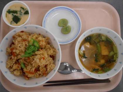 ほたてご飯、みそ汁、茶わん蒸し、茹でそらまめ、牛乳