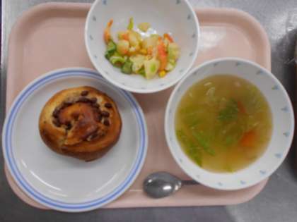 手作りあずきパン、レタススープ、ポテトサラダ、牛乳