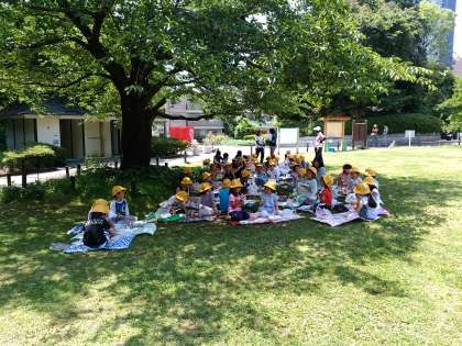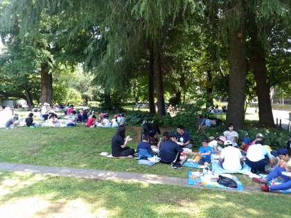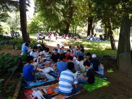 今日は学校を出て、菅刈公園の木陰でお弁当給食を食べています。