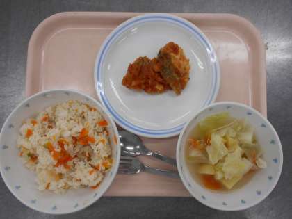 魚のサルサソース、やさいスープ、牛乳
