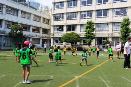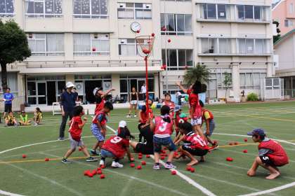 50人以上の児童が参加し、4チームに分かれてドッジビー、玉入れ、ひっくり返してポン、風船バレーボールをして楽しみました。