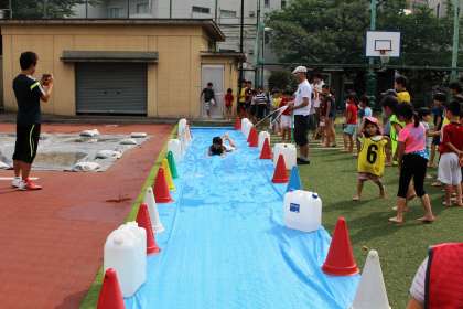 今日はとても暑い日だったので、サプライズ種目として、ウォータースライダーをしました。みんなびしょ濡れになりながら、滑っていました。