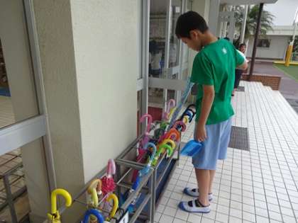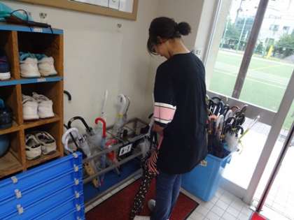 昇降口当番は雨が降っていたため、掃除をする場所が限られてしまいました。そこで、班で考えて傘の向きを揃えたり、高い順に並べたりときれいに傘を並び替えていました。