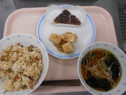 きんぴらご飯、ひやしそうめん汁、生揚げのそぼろ煮、