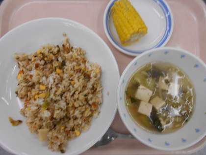 五目チャーハン、中華春雨スープ、とうもろこし、牛乳