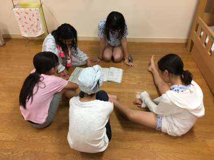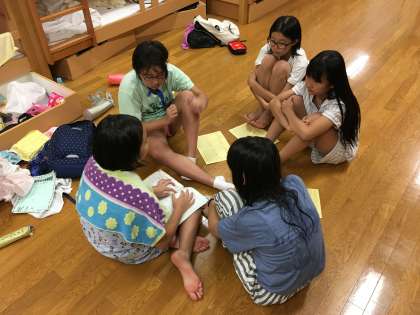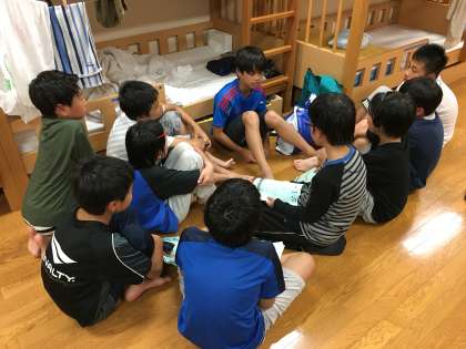 今日のふりかえりと明日のことについて、班長を中心にメンバーに伝えています。