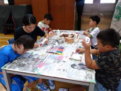 ものづくり体験では、貝やビーチグラス、宿舎の周りに落ちているドングリなども使って写真立てを作りました。