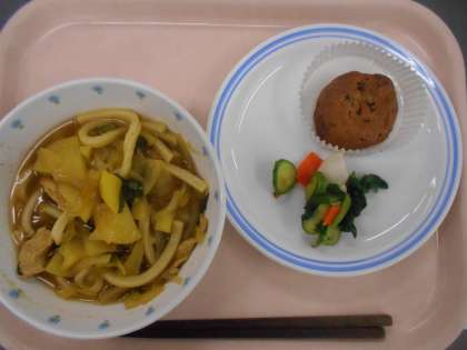 カレーうどん、そくせきづけ、手作りまんじゅう、牛乳
