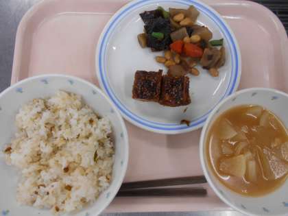 大根菜飯、大根のみそ汁、生揚げの田楽、大豆の五目煮、牛乳