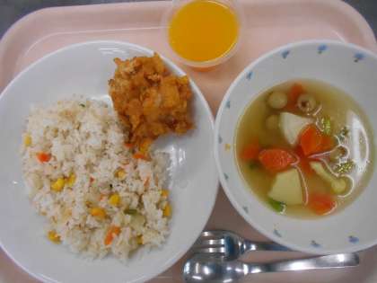 11月11日 2年1組と5年1組のリクエスト 公開日 2017/11/11 更新日 2017/11/11 給食 献立 ピラフ、パリパリチキン、カレースープ、みかんゼリー、牛乳 材料の主な産地 にんにく 青森県、にんじん ・じゃがいも・玉ねぎ 北海道、 ピーマン 宮崎県、生姜 高知県、セロリ 長野県、かぶ 千葉県、 カリフラワー 徳島県、鶏肉 宮崎県 いいね(0)