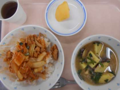 豚キムチ丼、さつまいものみそ汁、柿、牛乳