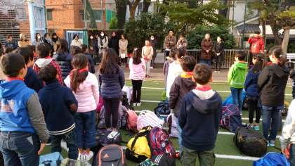学校で出発式を行いました。全員時間通り元気に集合しました。
