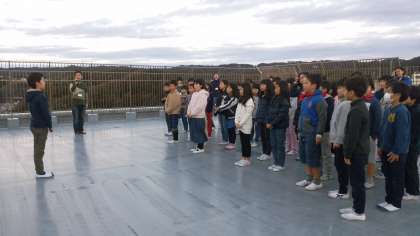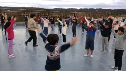 屋上で朝会、ラジオ体操をしました。ラジオ体操で体をしっかり目覚めさせます。