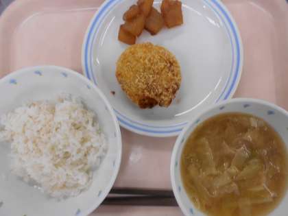 11月27日 かぼちゃのコロッケ 公開日 2017/11/27 更新日 2017/11/27 給食 献立 ごはん、かぼちゃのコロッケ、きゃべつと豚肉のゴマみそ汁、 こんにゃくのみそ田楽、牛乳 材料の主な産地 きゃべつ 愛知県、 たまねぎ かぼちゃ 北海道、切り干し大根 宮崎県、 ぶたにく 埼玉県、たまご 青森県 いいね(0)