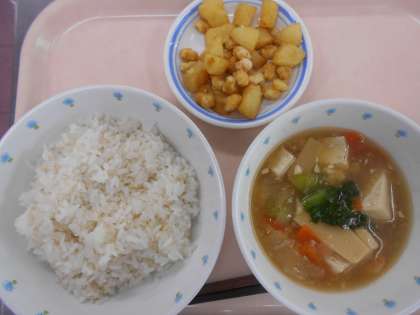 ごはん、シャーレン豆腐、ポテトと豆のカレー揚げ、麦茶