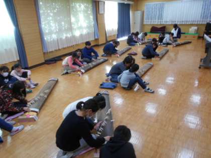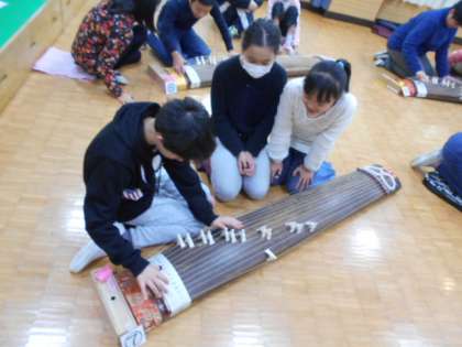 箏の体験授業では、友達同士で教え合いながら学習しました。