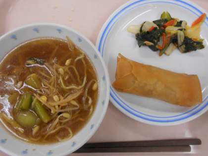 サンマ—メン、押し麦いり春巻き、オイスター炒め、