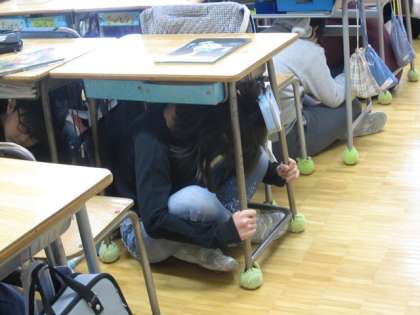 教員が教室にいないという設定で行いましたが、サイレンが鳴るとみんな一斉に机の下に入り、頭を守る姿勢をとっていました。