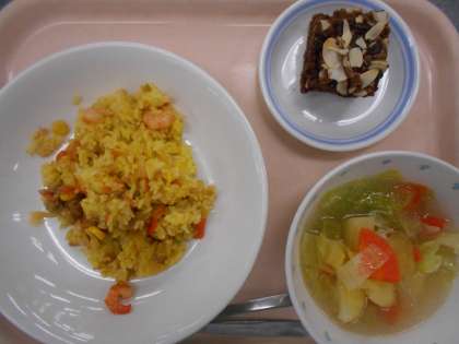 カレー味のピラフ、野菜スープ、チョコチップケーキ、牛乳