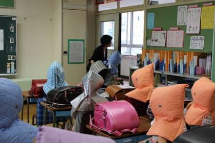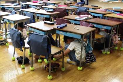 サイレンが鳴ると子供たちは反射的に机の下にもぐり、机の脚をしっかりと押さえていました。