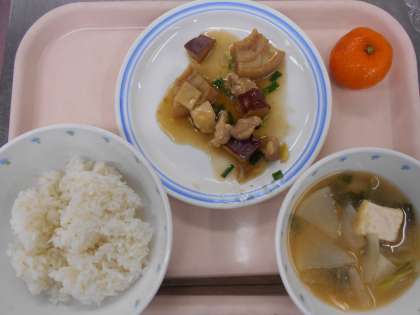 ごはん、治部煮、かぶのみそ汁、冷凍みかん、牛乳